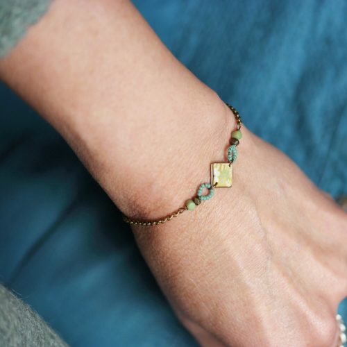 Bracelet carré au motif floral jaune pâle et perles bleues, collection Fibigie